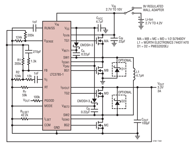 LTC3785-1 是一款高功率同步降压-升压型控制器,可从高于、低于和等于输出电压的输入电压来驱动全 N 沟道功率 MOSFET。凭借一个 2.7V 至 10V 的输入范围,LTC3785-1 非常适合于各种单节或双节锂离子电池或多节碱性/镍氢 (NiMH) 电池应用。