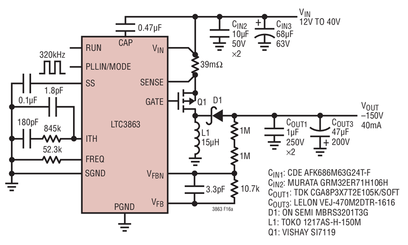 LTC3863 是一款稳固的负输出 DC/DC PMOS 控制器,专为汽车和工业应用而优化。其可驱动一个 P 沟道功率 MOSFET 以产生一个负输出,且只需单个电感器便可构成完整的电路。通常可实现 -0.4V 至 -150V 的输出电压,并能提供更高的电压 (仅受限于外部组件)。