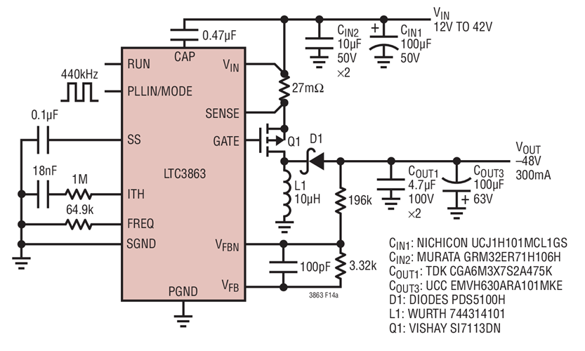 LTC3863 是一款稳固的负输出 DC/DC PMOS 控制器,专为汽车和工业应用而优化。其可驱动一个 P 沟道功率 MOSFET 以产生一个负输出,且只需单个电感器便可构成完整的电路。通常可实现 -0.4V 至 -150V 的输出电压,并能提供更高的电压 (仅受限于外部组件)。