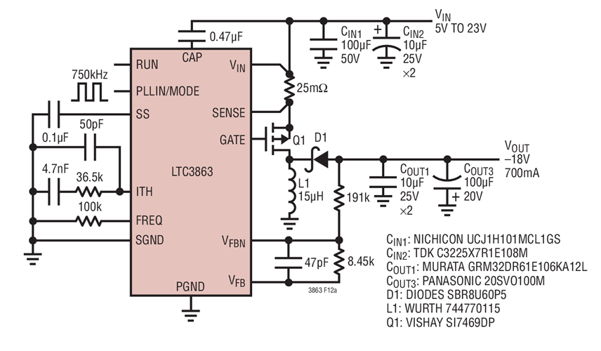 LTC3863 是一款稳固的负输出 DC/DC PMOS 控制器,专为汽车和工业应用而优化。其可驱动一个 P 沟道功率 MOSFET 以产生一个负输出,且只需单个电感器便可构成完整的电路。通常可实现 -0.4V 至 -150V 的输出电压,并能提供更高的电压 (仅受限于外部组件)。