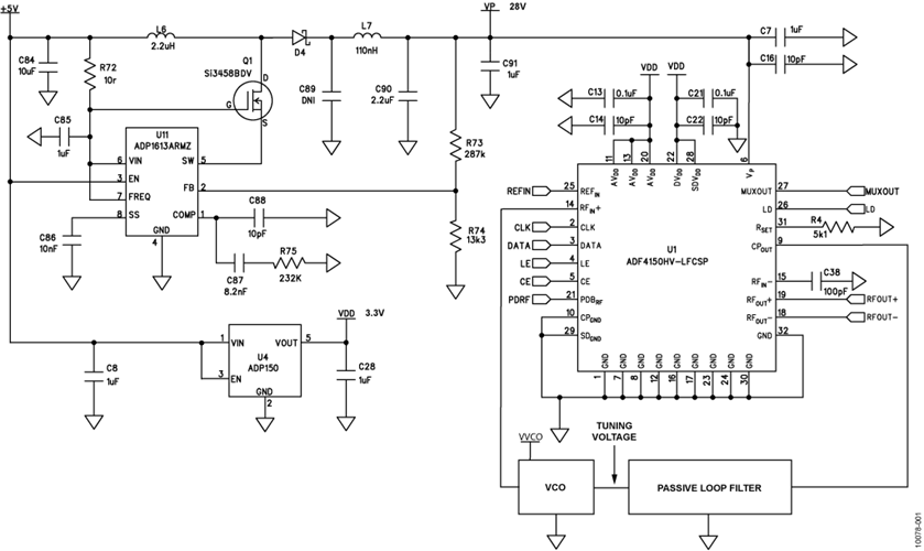 ADF4150HV是一款集成高压电荷泵的3.0 GHz小数N分频或整数N分频频率合成器。ADP1613提供ADF4150HV的高压集成电荷泵电源要求的28 V电压。