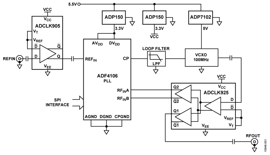 ADCLK905用于缓冲10 MHz REFIN频率源。许多应用通常采用10 MHz的参考频率。根据可用的信号摆幅,压摆率可能达不到ADF4106的50 V/μsec(最小值)压摆率要求。例如,10 MHz 0 dBm正弦波的压摆率只有20 V/μs。