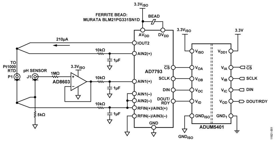 AD8603,是一款精密微功耗(最大值50 μA)及低噪声(22 nV/√Hz)CMOS运算放大器,配置为连接 AD7793通道之一输入的缓冲器。AD8603的典型输入偏置电流为200 fA,为高内部电阻pH探针提供了一种有效的解决方案。