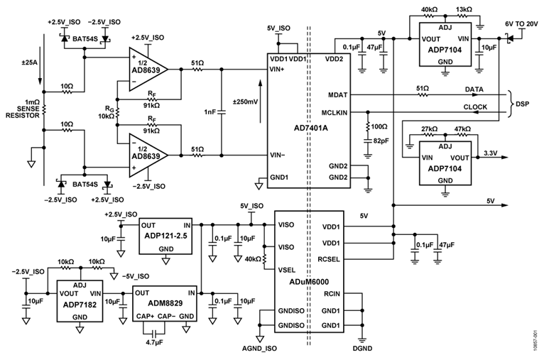 通过1 mΩ电阻的±25 A电流形成±25 mV的电压。 然后,该电压由AD8639放大至±250mV,并输入AD7401A。 AD7401A的差分输入充当传输三运算放大器仪表放大器配置中的差动放大器。