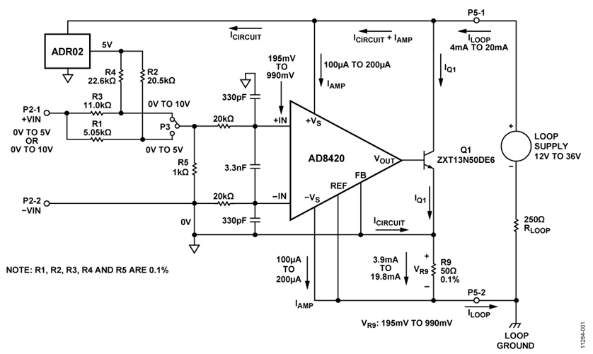 AD8420的间接电流反馈架构强制放大器的差分输入电压出现在其FB和REF引脚之间。然后,晶体管Q1把0.195 V至0.990 V电压范围转换成3.9 mA至19.8 mA的电流,流过R9 50 Ω检测电阻。