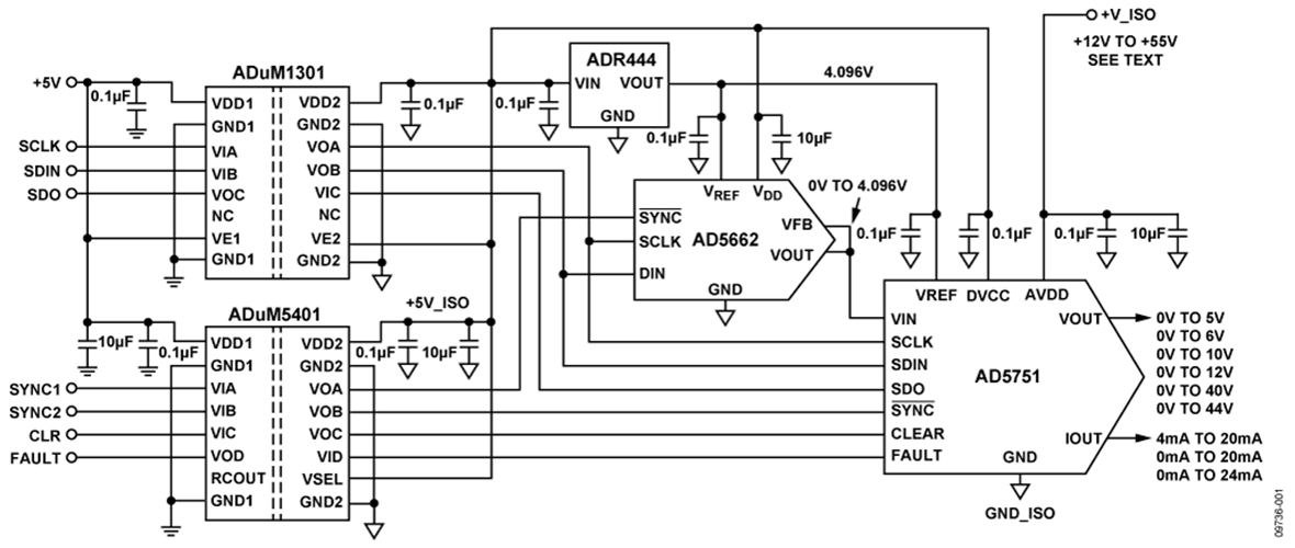AD5662 是一款低功耗(0.75 mW @ 5 V)、轨到轨输出、16位nanoDAC®器件,AD5751 是一款工业电流/电压输出驱动器,二者的输入和输出电压范围以及基准电压要求完全一致。