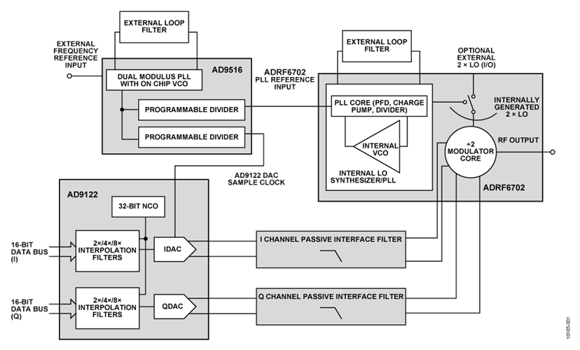 ADRF6702包括一个板载分数PLL用于LO生成,这样只需一个低频参考(一般低于100 MHz)即可合成IQ调制器LO。在AD9516时钟发生器内使用PLL允许一个参考同时为ADRF6702产生DAC采样时钟和PLL参考。