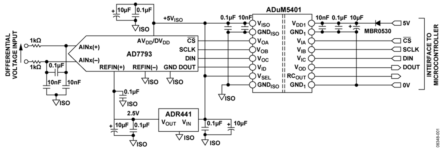 ADuM5401是一款采用ADI公司iCoupler®技术并集成isoPower技术的四通道隔离器。它可用来在现场端与系统微控制器之间实现隔离,隔离额定值为2.5 kV(均方根值)。ADuM5401还集成了DC-DC转换器,可在5 V或3.3 V时提供500 mW的稳压隔离电源。本设计利用ADuM5401提供的5 V电压为输入模块上的所有模拟电路供电。所有四条数据线都得到利用:三条用于发射, (CS, SCLK, DIN) 一条用于接收(DOUT),这些线与标准SPI接口相连。