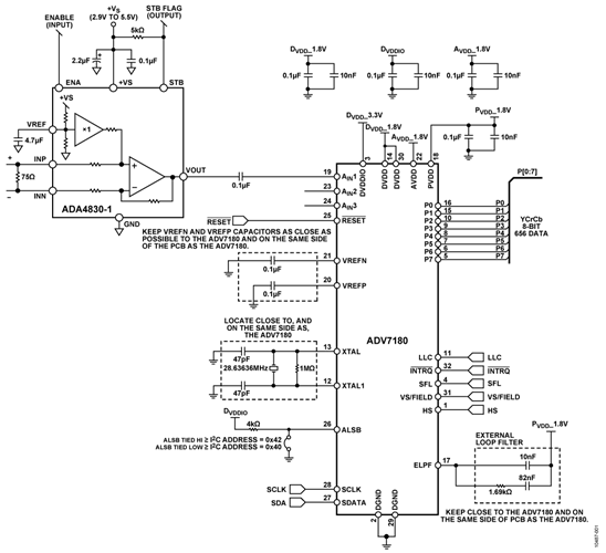 通过10μF和0.1μF电容对ADV7180的电源进行去耦。此外,采用0.1μF和22μF电容对ADA4830-1进行去耦,以适当抑制噪声并减小纹波。这些电容应尽可能靠近相应器件,以确保0.1μF电容具有低ESR值。对于所有高频去耦,建议使用陶瓷电容。