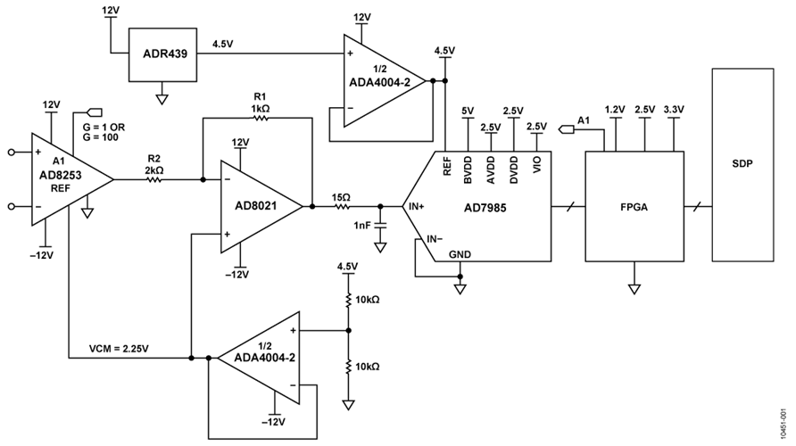 AD8021是能够驱动 AD7985的2.1 nV/√Hz低噪声、高速放大器。该器件还会对 AD8253输出进行电平转换和衰减。 AD8253 和 AD8021 均采用2.25 V的外部共模偏置电压工作,两者结合以在ADC的输入端维持相同共模电压。基准电压为4.5 V时,ADC的输入范围为0 V至4.5 V。