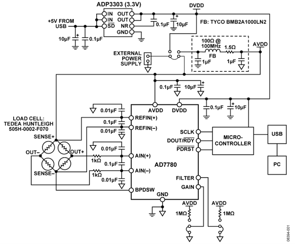 有多种方法可以为该电子秤系统供电,例如:利用主电源总线,或者利用ADP3303 (3.3 V)。用5 V电压激励电子秤时,必须使用主电源总线。用3.3 V电压激励称重传感器时,可以使用主电源总线或ADP3303 (3.3 V)。ADP3303 (3.3 V)是一款低噪声稳压器。此外,按照ADP3303 (3.3 V)数据手册的建议,在稳压器输出端配有降噪电容。为优化电磁屏蔽,稳压器输出先经过滤波,然后再给AD7780和称重传感器供电。由于电源或接地层上的任何噪声都会给系统带来噪声,导致电路性能降低,因此必须用低噪声稳压器产生供给AD7780和称重传感器的电源。