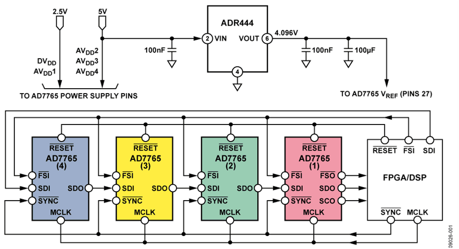 每个AD7765利用公共采样时钟(MCLK)、同步信号(SYNC)和复位信号(RESET)提供时钟,如图1所示。ADR444提供的4.096 V公共基准电压(使用图5所示电路)以星形单点配置施加于每个AD7765(各ADC内置基准电压缓冲器)。