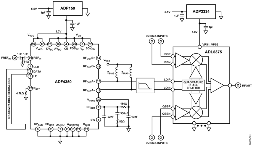 图1所示电路使用完全集成的小数N分频PLL ICADF4350和宽带发射调制器ADL5375。ADF4350向发射正交调制器ADL5375提供本振(LO)信号,后者将模拟I/Q信号上变频为RF信号。两个器件共同提供宽带基带I/Q至RF发射解决方案。ADF4350采用超低噪声3.3 V ADP150调节器供电,以实现最佳LO相位噪声性能。ADL5375则采用5 V ADP3334 LDO供电。ADP150 LDO的输出电压噪声仅为9 μV均方根值,有助于优化VCO相位噪声并降低VCO推挤(相当于电源抑制)的影响。