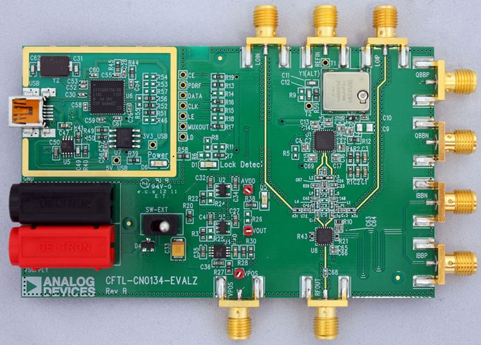 The CFTL-0134-EVALZ evaluation board contains the circuit described in circuit note CN-0134, allowing for the quick setup and evaluation of the circuit’s performance. The control software for the CFTL-0134-EVALZ board uses the standard ADF4350 programming software, located on the CD that accompanies the evaluation board.