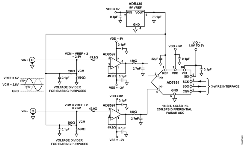 虽然通过内置缓冲器生成VCM信号来偏置输入非常普遍,但是此电路无需缓冲器即可实现额定性能。