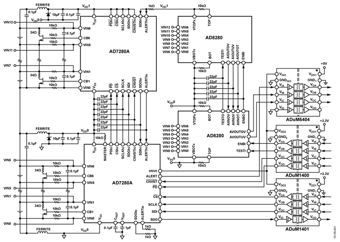 ADuM5404集成一个DC-DC转换器,用于向ADuM1400和ADuM1401隔离器的高压端供电,以及向AD7280A SPI接口提供VDRIVE电源。这些4通道、磁性隔离电路是安全、可靠、易用的光耦合器替代解决方案。