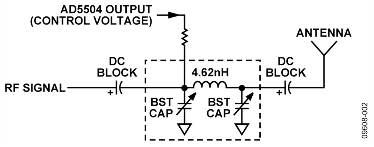 使用图1所示的电路,可产生最高30 V的DAC输出电压。输出电压用于设置BST电容的偏置电压,进而调节天线响应。图2显示用作可调匹配网络的BST电容等效电路,图3显示BST电容与偏置电压和所产生天线响应的传递函数关系。有关BST电容的更多信息,请访问: www.agilerf.com。