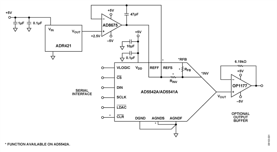 请注意,AD5541A不包含基准电压和地上的开尔文检测线路、清零功能以及RFB 和 RINV电阻。