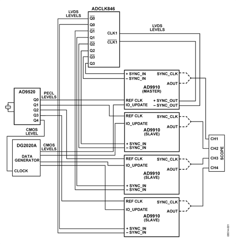 该设置将AD9520用作各AD9910 DDS的参考时钟源。AD9520利用外部晶振和内部PLL工作,将相位对准的1 GHz参考时钟(PECL输出)分配给所有四个AD9910评估板。它还向Tektronix DG2020A数据模式发生器提供CMOS输出时钟,用于IO_UPDATE。