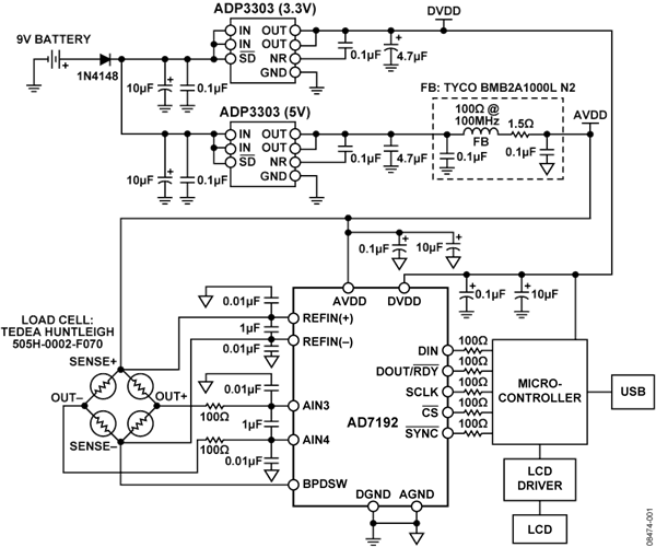 有多种方法可以为该电子秤系统供电,例如:利用主电源或利用电池(如图1所示)供电。一个5 V低噪声稳压器用来确保AD7192和称重传感器获得低噪声电源。低噪声稳压器ADP3303 (5 V)用来产生5 V电源。虚线框内显示的滤波器网络用来确保系统获得低噪声AVDD。此外,按照ADP3303 (5 V)数据手册的建议,在稳压器输出端配有降噪电容。为优化电磁屏蔽性能,稳压器输出先经过滤波,然后再给AD7192和称重传感器供电。3.3 V数字电源可利用ADP3303 (3.3 V)稳压器产生。由于电源或接地层上的任何噪声都会给系统带来噪声,导致电路性能降低,因此必须用低噪声稳压器产生供给AD7192和称重传感器的全部电源。