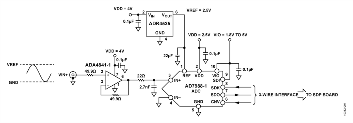 AD7988-1 ADC需要2.4 V至5.1 V间的外部基准电压。本应用中,选择的基准电压是ADR4525 精密2.5 V基准电压源。