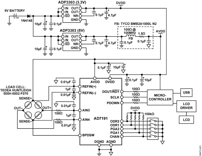 有多种方法可以为该电子秤系统供电,例如:利用主电源或利用电池(如图1所示)供电。一个5 V低噪声稳压器用来确保AD7191和称重传感器获得低噪声电源。低噪声稳压器ADP3303 (5 V)用来产生5 V电源。虚线框内显示的滤波器网络用来确保系统获得低噪声AVDD。此外,按照ADP3303 (5 V)数据手册的建议,在稳压器输出端配有降噪电容。为优化电磁屏蔽性能,稳压器输出先经过滤波,然后再给AD7191和称重传感器供电。3.3 V数字电源可利用ADP3303 (3.3 V)稳压器产生。由于电源或接地层上的任何噪声都会给系统带来噪声,导致电路性能降低,因此必须用低噪声稳压器产生供给AD7191和称重传感器的全部电源。