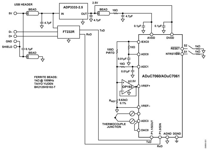 在本电路中,ADuC7060/ADuC7061连接到一个热电偶和一个100 Ω Pt RTD。RTD用于执行冷结补偿。