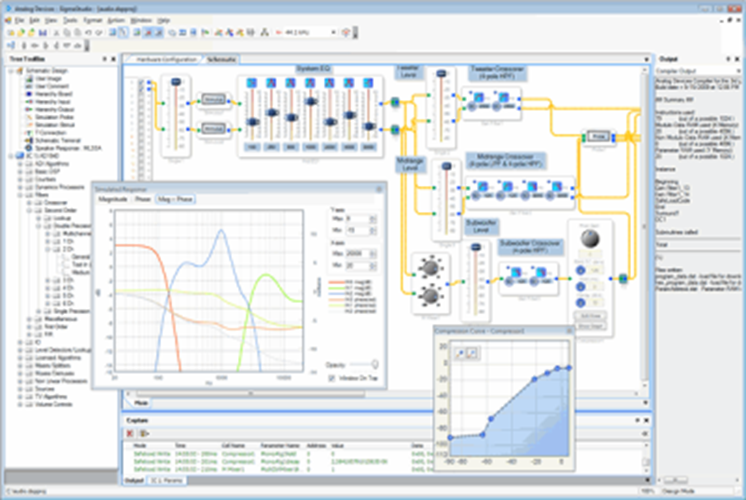 SigmaStudio™图形开发工具是专用于SigmaDSP®音频处理器的编程、开发和调整软件。 常见的音频处理模块可连接成原理图,编译器产生可供DSP使用的代码和用于设置、调整参数的控制界面。 利用该工具,没有编写DSP代码经验的工程师能够轻松地在其设计中实现DSP,同时该工具足够强大,可以满足有经验DSP设计人员的需求。 SigmaStudio可与ADI公司的评估板和产品设计连接,以提供完整的在线实时IC控制。