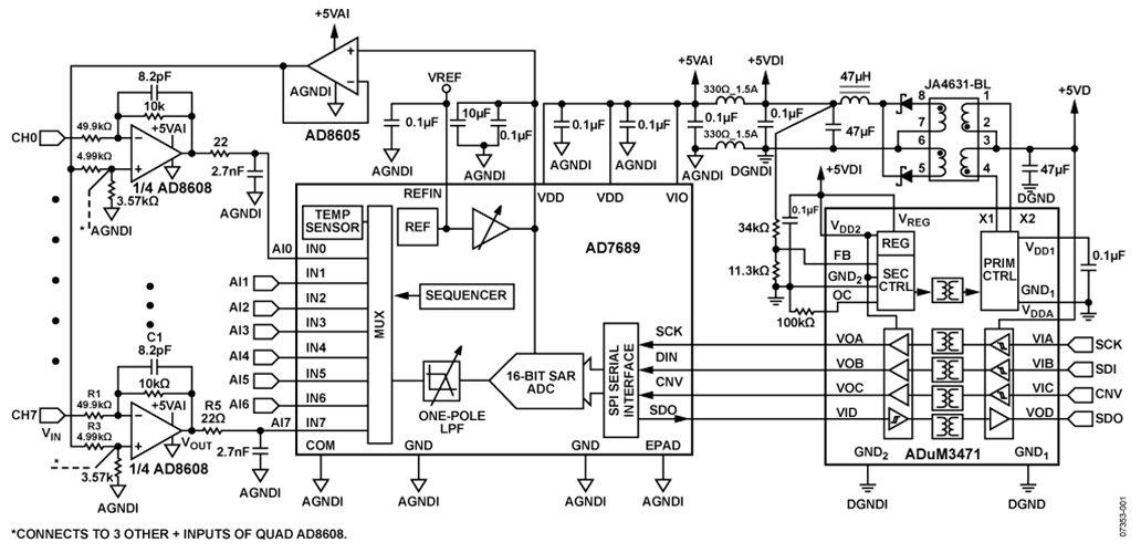 此电路配合 16位、8通道、250 kSPS PulSAR ADC AD7689 和两个低成本精密四通道运算放大器 AD8608 使用,在数据采集系统内提供所有信号调理和数字化功能。另外仅需要AD8605运算放大器,用于缓冲AD7689的基准电压。