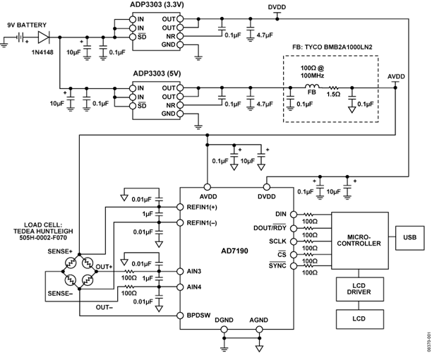 AD7190是一款高精度ADC,适用于高端电子秤。其它合适的ADC有AD7192和AD7191。AD7192与AD7190引脚兼容,但前者的均方根噪声略高。当输出数据速率均为4.7 Hz时,AD7192的均方根噪声为11 nV,AD7190的均方根噪声为8.5 nV。AD7191是一款引脚可编程器件,具有四种输出数据速率和四种增益设置。由于它具有引脚可编程能力,并且功能较少,因此易于使用。AD7191的均方根噪声与AD7192相同。