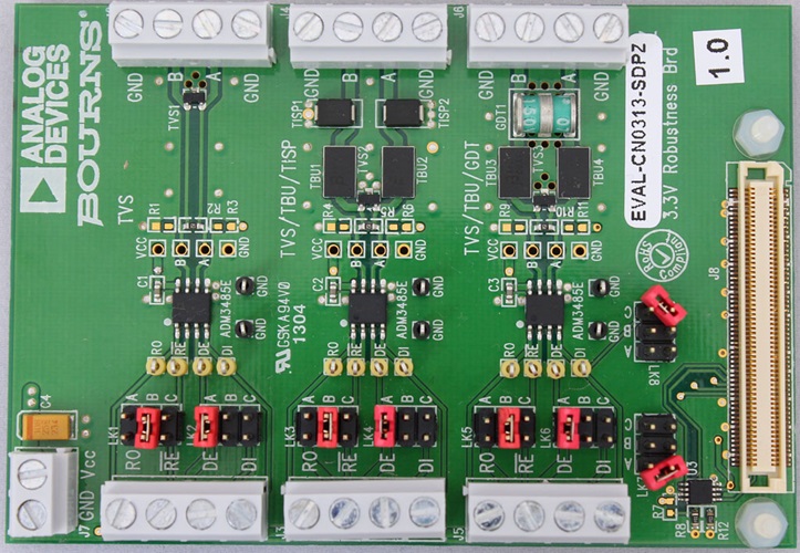 图2显示EVAL-CN0313-SDPZ板的实物照片。电路板上有三 个ADM3485E器件,每个器件用于一种保护方案。每种保护方案都提供本文描述的ESD和EFT保护,并提升电涌保护等级。